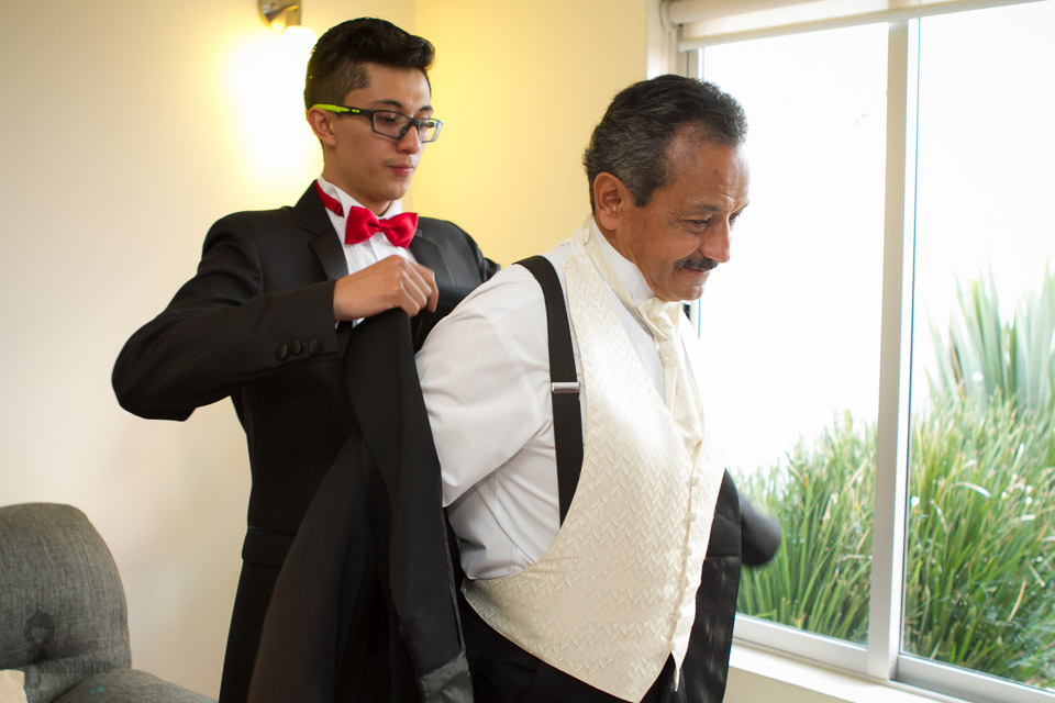 Nos invitaron a cubrir su renovación de votos en una ceremonia que fue bastante emotiva, y como todo gran aniversario fue planeada y llevada a cabo a la perfección, me citaron para cubrir el arreglo de los novios (y de la familia) en su casa, la verdad es que nuestro trabajo es más fácil cuando se nos da la confianza que ellos nos brindaron, todo era movimiento en el lugar, la novia estaba siendo peinada y maquillada impecablemente por unas chicas muy agradables y el novio estaba casi listo, sus hijos y sobrinos así como mucha familia estaban alistandose para salir a la ceremonia que se llevo acabo en una iglesia muy hermosa.