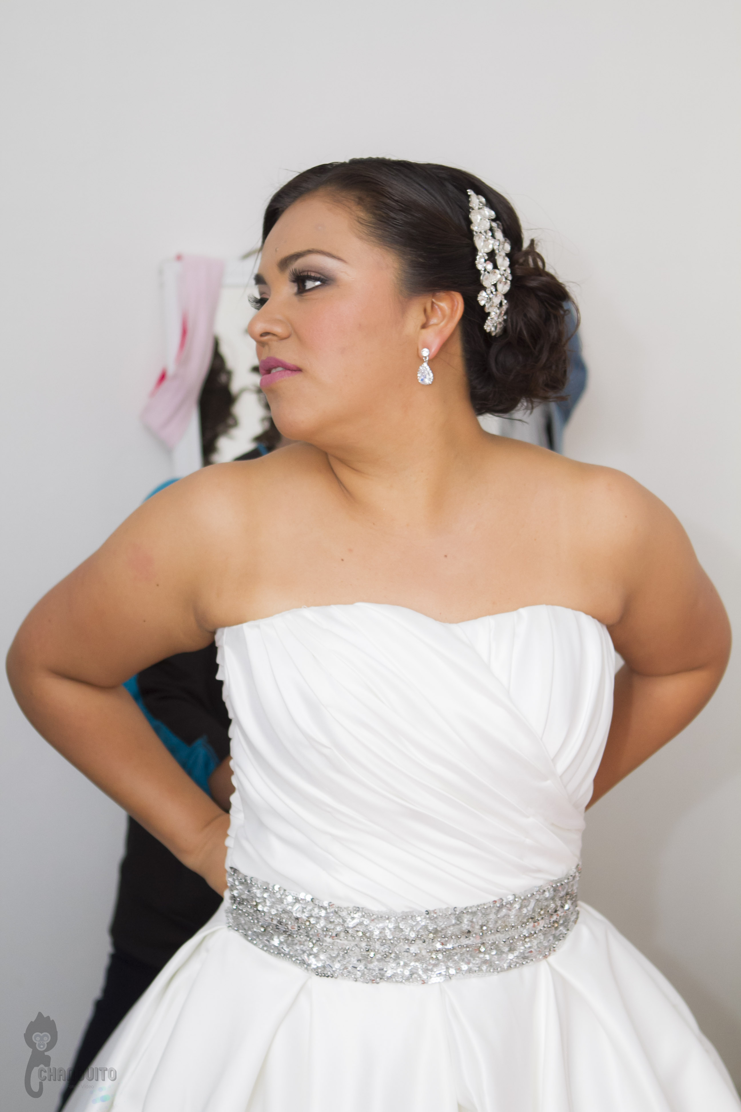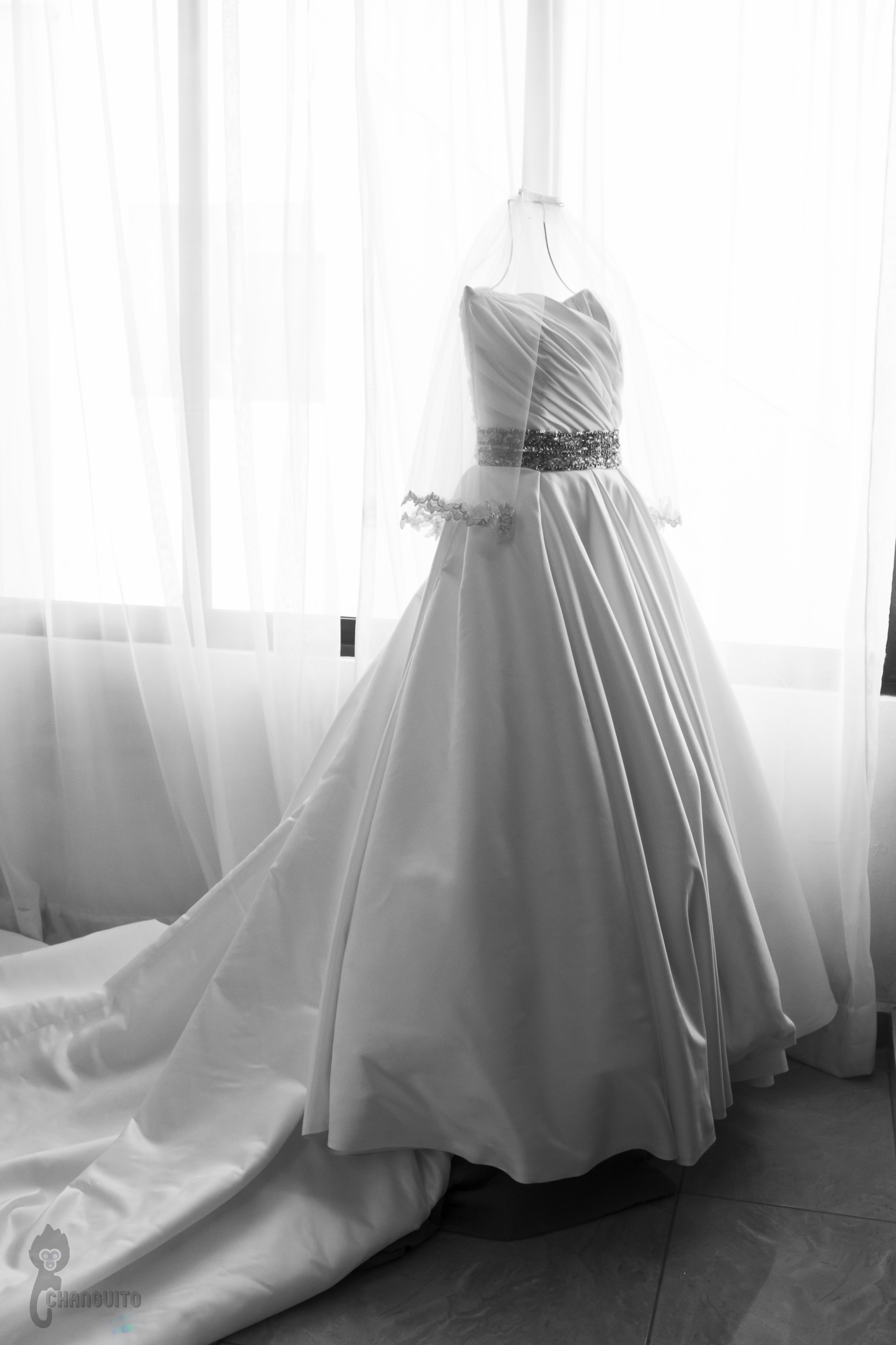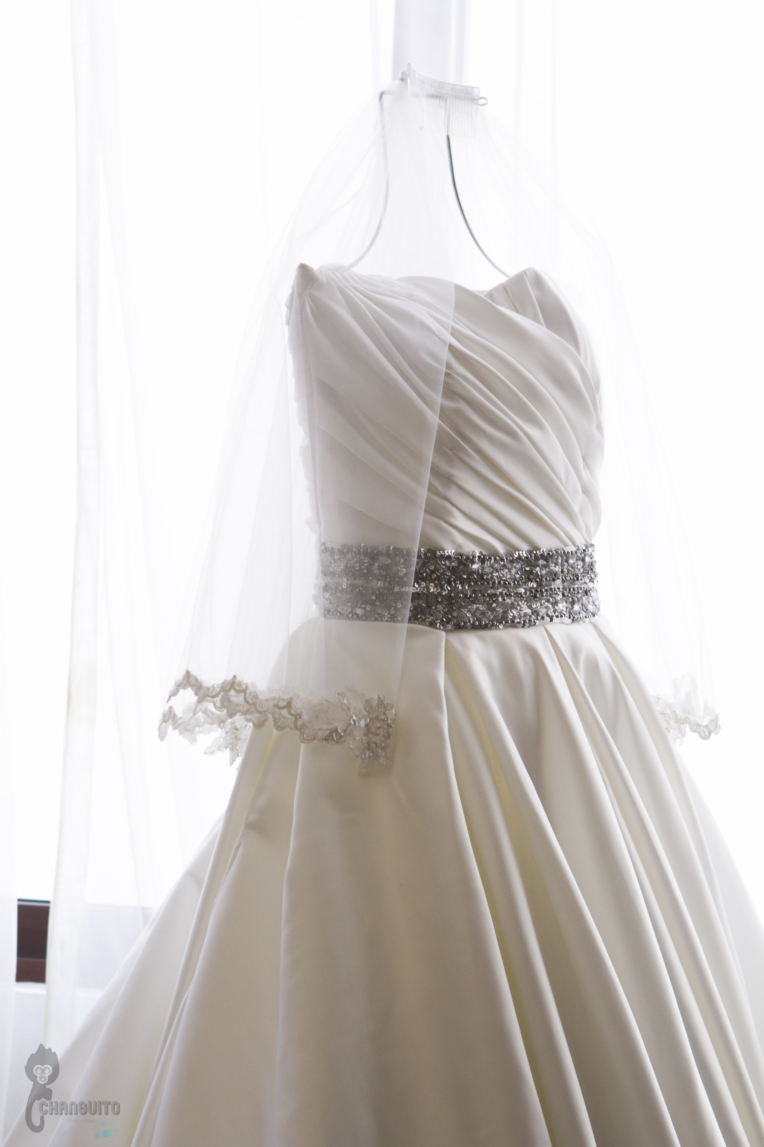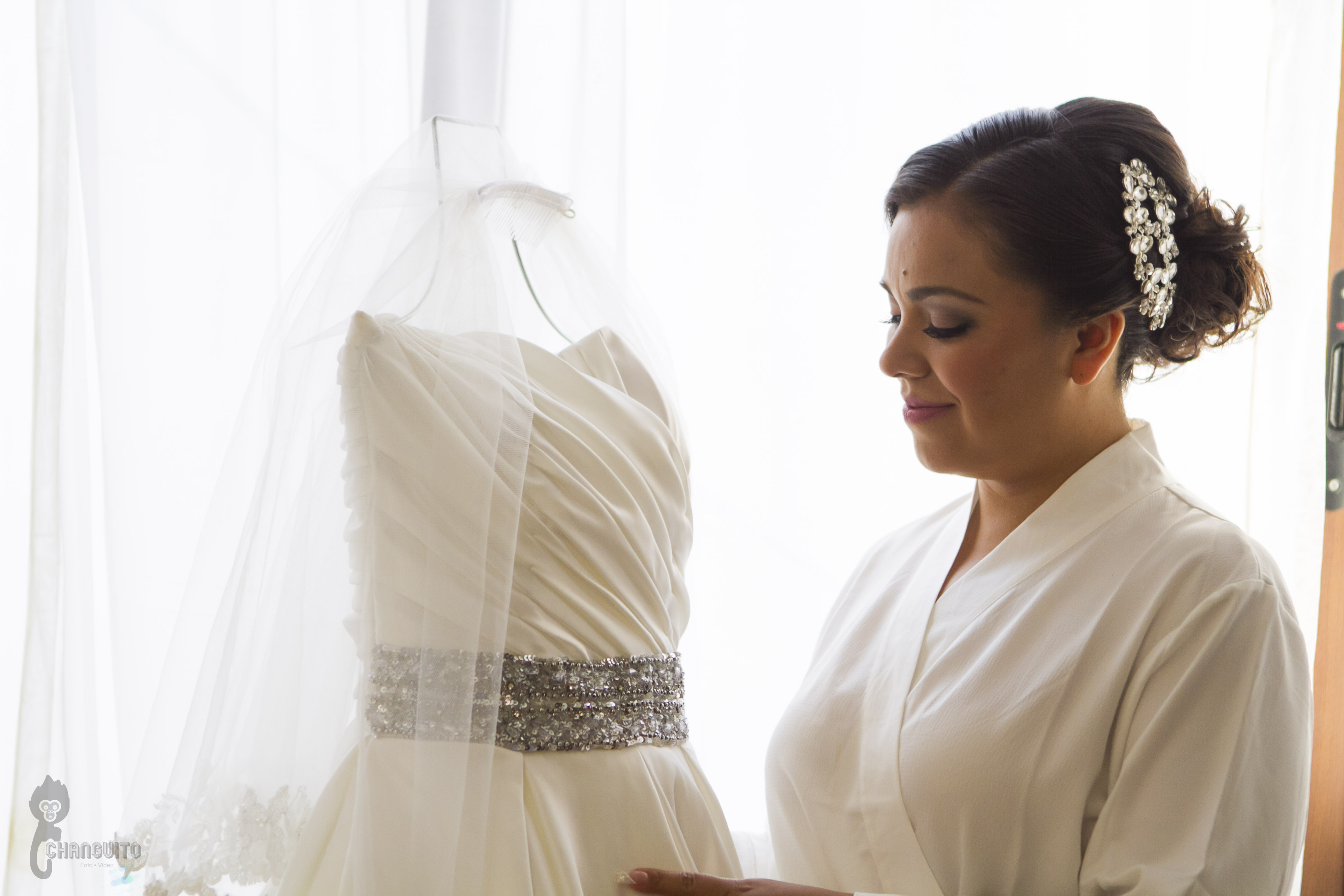 Llegamos temprano a casa de Marijo, éramos muchos en el lugar, nosotros cuatro (dos de foto y dos de video) para tener la mayor cobertura del evento más la familia, maquillistas, peinadores, chambelanes, mascotas y demás, todo era movimiento en el lugar pero siempre reino la calma y la alegría, Marijo nos dio acceso a su recamara y ahí estaba su vestido y nos dimos a la tarea de hacer lo que tanto nos gusta, un registro meticuloso de detallitos y demás accesorios.